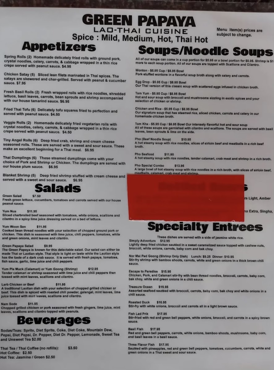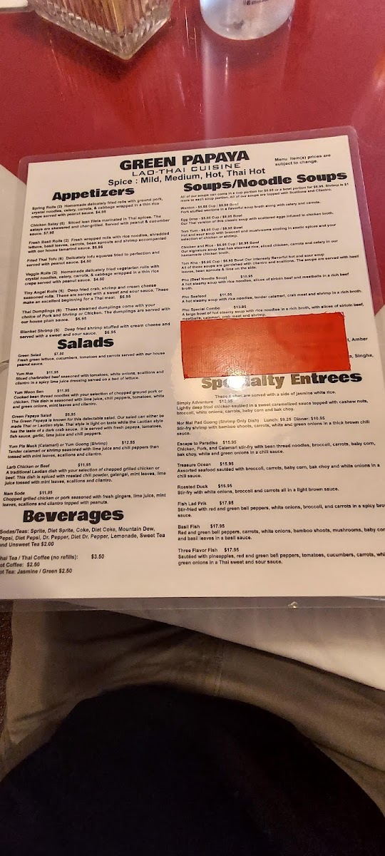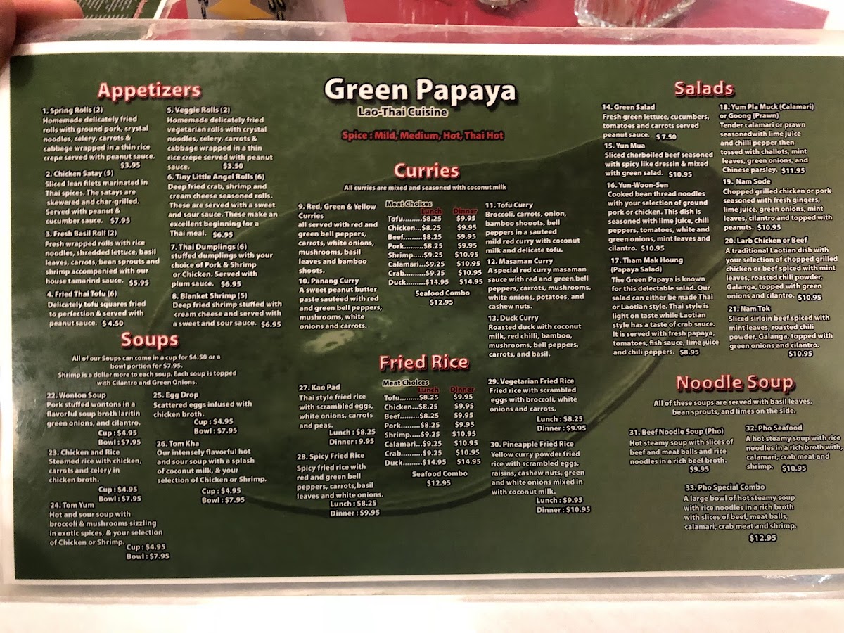 The Green Papaya is known for this delectable salad. Our salad can either be made Thai or Laotian style. Thai style is light on taste while the Laotian style has the taste of a dark crab sauce. It is served with fresh papaya, tomatoes, fish sauce, garlic, lime juice and chili peppers.