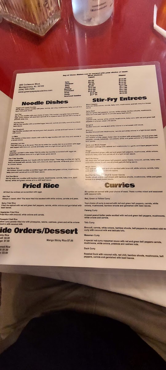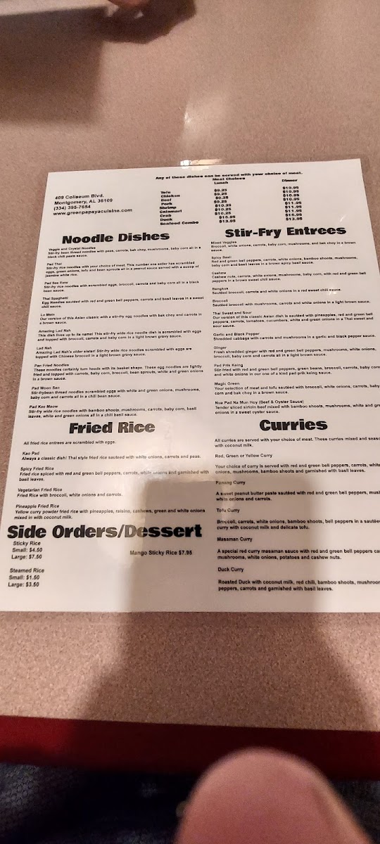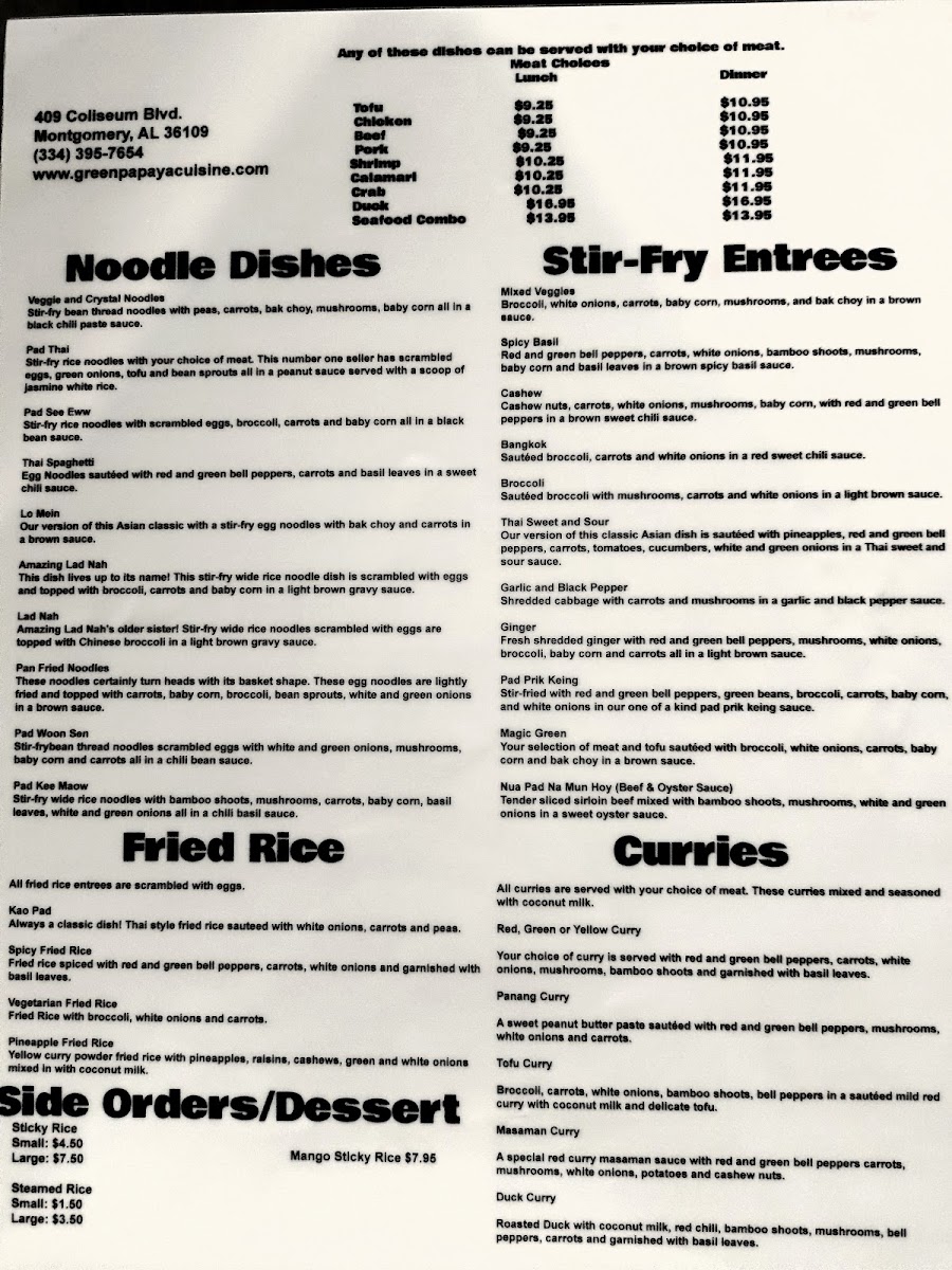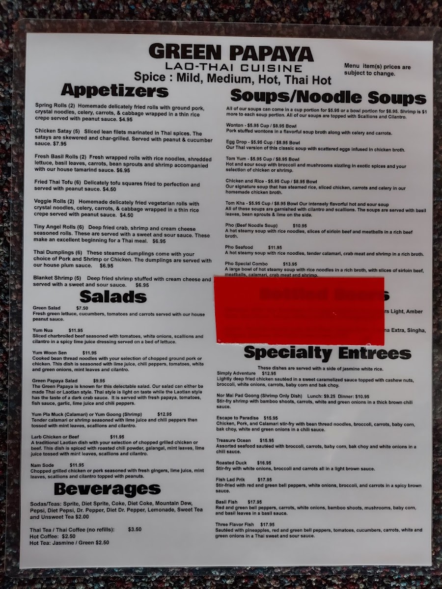 The Green Papaya is known for this delectable salad. Our salad can either be made Thai or Laotian style. Thai style is light on taste while the Laotian style has the taste of a dark crab sauce. It is served with fresh papaya, tomatoes, fish sauce, garlic, lime juice and chili peppers.